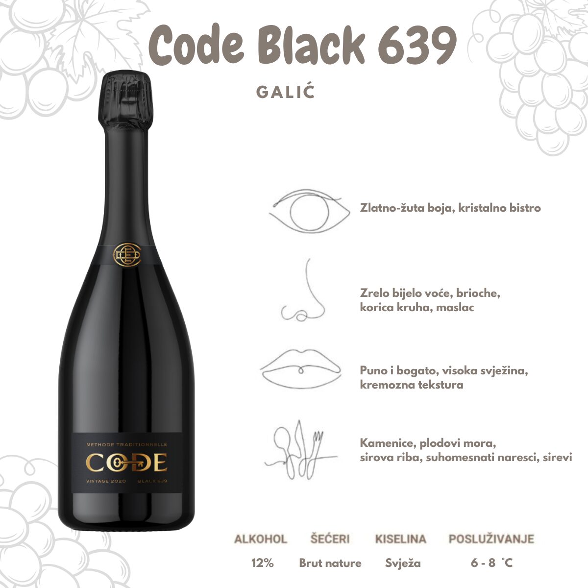Punog i bogatog okusa uz pomalo slasti koja nije rezultat šećera nego složenih alkohola. Idealan pritisak finih i postojanih mjehurića i visoka kiselina daju mu svježinu ozbiljnih šampanjaca. Kompleksnost mu podiže lagana gorčina u pamtljivoj i dugotrajnoj završnici. Vino je gastronomsko, a kako je otvorena sezona kamenica Black Code će biti idealan izbor, jednako dobro će pratiti i ostale plodove more, prije svega salate i razna jela od sirove ribe, ali i tradicionalne suhomesnate nareske uz mlađe do srednje zrele sireve.